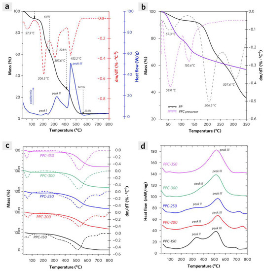 (a) TGA, DTA, and DSC curves of PP in air at a heating rate of 5 °C/min within a temperature range from room temperature to 800 °C, (b) TGA and DTA curves of PP and PPC precursor in air at a heating rate of 5 °C/min within temperature range from room temperature to 350 °C. (c) TGA, DTA, and (d) DSC curves of PPCs in air at a heating rate of 5 °C/min within a temperature range from room temperature to 800 °C.