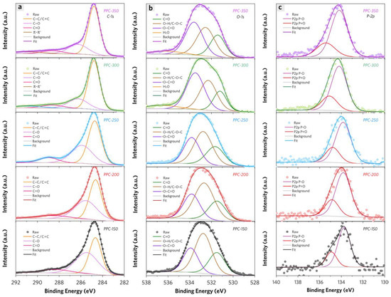High-resolution XPS patterns of PPCs including (a) C-1s, (b) O-1s, (c) P-2p spectra of PPCs with deconvoluted curves in detail.