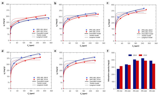 Adsorption isotherms for methylene blue (MB) on PPC-150 (a), PPC-200 (b), PPC-250 (c), PPC-300 (d), and PPC-350 (e) at 293 K and 313 K; (f) The adsorption capacity of PPCs with an initial MB concentration of 500 ppm, an adsorbent dosage of 0.5 g/L at 293 K and 313 K.