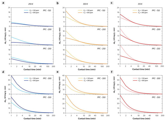 Apparent adsorption rate curves of MB on PPC-I (a) at 293 K, (b) at 303 K, (c) at 313 K and PPC-II (d) at 293 K, (e) at 303 K, (f) at 313 K versus contact time.