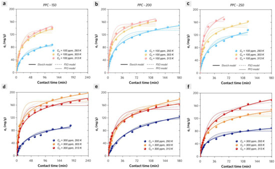 Experimental adsorption kinetic data of methylene blue (MB) on (a,d) PPC-150, (b,e) PPC-200, and (c,f) PPC-250 with different initial concentrations (100 ppm and 300 ppm) of MB at 293 K, 303 K, and 313 K. The fitted Elovich model curves (straight heavy line), pseudo-first-order model curves (straight fine line), and pseudo-second-order model curves (dashed fine line) are also presented.