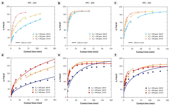 Experimental adsorption kinetic data of methylene blue (MB) on (a,d) PPC-250, (b,e) PPC-300, and (c,f) PPC-350 with different initial MB concentrations (100 ppm and 300 ppm) at 293 K, 303 K, and 313 K. The piece-wise fitted intra-particle diffusion model curves (straight line) are also presented.