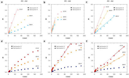 Boyd plots of MB adsorption on (a,d) PPC-250, (b,e) PPC-300, and (c,f) PPC-350 with different initial MB concentrations (a–c) 100 ppm and (d–f) 300 ppm at 293 K, 303 K, and 313 K.