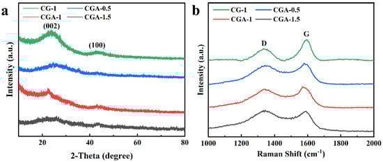 The XRD patterns of CG-1, CGA-0.5, CGA-1, and CGA-1.5 are shown in Figure 1a. There were two broad, weak peaks detected at 23° and 43°, which are attributed to (002) and (100) reflections, respectively. The (002) peak suggests that there was parallel stacking of graphene sheets inside the material, while the (100) peak was caused by the sp2 hybrid carbon. The presence of these two peaks indicates the formation of an amorphous structure [33]. The peak intensity of the CG-1 samples at 23° was stronger than that of the others, which means that the addition of the activator KOH promoted the formation of amorphous carbon. The peak (002) in the figure shows that the amorphous carbon material contained some fine graphite crystallites. These graphite crystallites were formed by stacking several layers of graphene sheets. The distance of the graphene sheets (d002) and the thickness of the graphite crystallites (L) can be calculated by Bragg’s law (Equation (1)) and Scherrer’s formula (Equation (2)), respectively, as follows [34]: