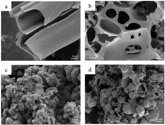 The microstructure and morphology of the samples were characterized using SEM, as shown in Figure 2. Figure 2a is the image of CG-1 without activation treatment. It can be observed that cattail grass fluff still maintained its fibrous structure, while the other samples added with KOH were damaged to various degrees, and the amount of activator enhanced the degree of fragmentation. Compared with CG-1, CGA-0.5 presented some larger pores and defect structures, as shown in Figure 2b, which increased the specific surface area and provided more channels for ion transport. From Figure 2c, it can be seen that the surface of CGA-1 was corroded, with increasing roughness and many fragmentations appearing on the surface. The degree of damage to CGA-1.5 was further increased, as shown in Figure 2d, which formed more pore structures. It is worth noting that activation treatment can change the morphology and structure of the samples to create more pores and defect structures, which is beneficial to improving the performance of the LIBs.