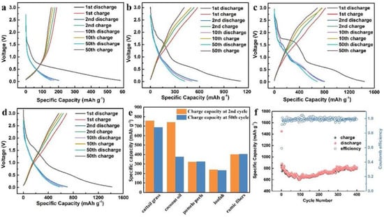 The charge–discharge curves of (a) CG–1, (b) CGA–0.5, (c) CGA–1, and (d) CGA–1.5; (e) comparison of cattail grass with the state-of-the-art LIBs; and (f) cycling performance of the CGA-1 at a current density of 0.1 A g−1 in LIBs.