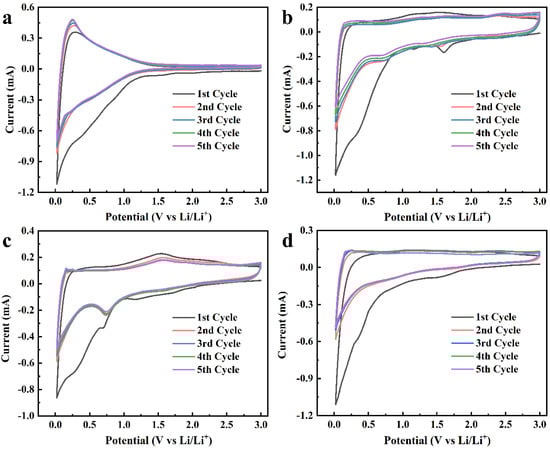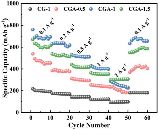 Figure 5 shows the CV plots at a scan rate of 0.5 mV s−1 at 0.02~3 V of the samples. In the first cycle, it can be seen that a small reduction peak appeared around 0.3 V, corresponding to the reaction of the electrode material surface with the electrolyte to form an SEI film [39]. In the subsequent cycles, the peak disappeared, which means that the SEI film had formed at the first cycle. In addition, there was another reduction peak near 1.5 V in the CV curves of CGA-0.5, CGA-1, and CGA-1.5, which was caused by the irreversible reaction of lithium ions and materials [7]. In the subsequent cycles, the peak disappeared, and the CV curves had a good degree of coincidence, which reveals that the materials have excellent cycle stability. In five cycles, the CV curves of CGA-0.5, CGA-1, and CGA-1.5 had reduction peaks near 0.7 V with different intensities, among which the peak of CGA-1 was the most obvious; this may be due to the redox reaction between the functional groups of the materials and lithium ions.
