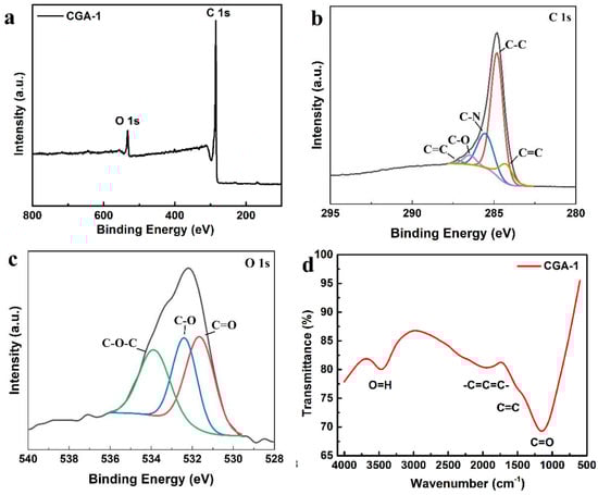 To further investigate the functional groups contained in CGA-1, XPS and IR were carried out, as shown in Figure 6. Figure 6a is the full-spectrum analysis diagram of CGA-1. There are two peaks centered at 284 eV and 533 eV, corresponding to the C 1s peak and the O 1s peak, respectively, indicating that the material contained mainly carbon and oxygen. The C 1s peak in Figure 6b can be split into five peaks of 284.4 eV, 284.8 eV, 285.6 eV, 286.5 eV, and 287.2 eV, which were assigned to the C=C, C-C, C-N, C-O, and C=O functional groups, respectively. The different chemical states of oxygen can be determined by the O 1s peak in Figure 6c, where three peaks located at 531.7 eV, 532.4 eV, and 533.7 eV correspond to C=O, O-C, and C-O-C functional groups, respectively. Figure 6d is the infrared spectrum of CGA-1. It can be seen that the material contained C=O, C=C, -C=C=C-, and O-H functional groups, which agrees well with the XPS results. The sample contained a large amount of carbon and oxygen, and the main functional groups were C=C, C-C, C-O, and C=O. These functional groups are conducive to forming chemical bonds with lithium ions to enhance energy storage. In addition, no other significant absorption peaks were observed, indicating the absence of additional valence bonds forming between the prepared electrodes. In this case, the results are in agreement with the XRD pattern, confirming the successful preparation of the derived carbon electrodes.