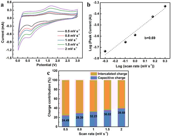 To further demonstrate the storage mechanism of the CGA-1, quantitative analysis of CV at different scan rates from 0.5 mV s−1 to 2.0 mV s−1 was performed based on Dunn’s test, as shown in Figure 7a. The scan rate (v) and peak current (i) obey Equation (3), where a and b are variable parameters. Notably, b is related to the intrinsic reaction kinetics of the electrodes, in which a b value of 0.5 demonstrates that the current is contributed by ion diffusion control, and a b value of 1 represents that the current is fully dominated by the capacitive behavior. In Figure 7b, the b value was calculated to be 0.69 between 0.5 and 1, which illustrates the mixed mechanisms in the charge storage process. Furthermore, the current response (i) measured at a fixed voltage can be distinguished into two parts of the contribution through Equation (4), where k1v represents the contribution of the capacitive process and k2v1/2 corresponds to the process of diffusion control. At different scanning rates from 0.5 mV s−1 to 2.0 mV s−1, the capacitive charge contribution of the CGA-1 is shown in Figure 7c. A slow scanning rate is beneficial to the full contribution of the diffusion-controlled process of connecting the redox peaks [1]. With the increase in scan rate, the diffusion contribution decreased and the capacitance contribution increased, which demonstrates that the porous structures and multi-functional groups result in fast charge transfer and facilitate the adsorption of ions [37].