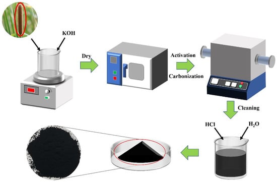 The sample preparation process is illustrated in Figure 8. Cattail grass fluff was collected from the flower spike, mixed with KOH activator in a mass ratio of 1:3, and magnetically stirred for 24 h. Then, the samples were dried in an oven. The dried samples were placed in a vacuum tube furnace under an Ar atmosphere (99.99%) at 800 °C for 0.5 h, 1 h, and 1.5 h, respectively, and were denoted as cattail grass with activation treatment (CGA)-0.5, CGA-1, and CGA-1.5. After that, the samples were washed with 1 mol L−1 HCl and distilled water to adjust the pH value to neutral. In addition, a sample of cattail grass fluff was also prepared at 800 °C for 1 h. This sample was used as a control group without KOH and was named CG-1.
