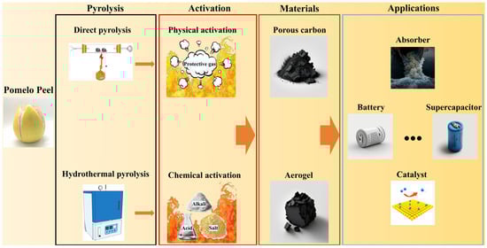 As shown in Figure 1, in this review, we will summarize the process of upgrading PP into porous carbon nanomaterials through direct pyrolysis and hydrothermal pyrolysis. Afterwards, we focus on the activation step, including physical activation, chemical activation, and their combination, which directly affects the properties of the produced porous carbon nanomaterials. Subsequently, the applications of the porous carbon nanomaterials obtained from pyrolyzed PP were summarized, such as adsorbers, batteries, supercapacitors, and catalysts. Finally, the discussions are concluded with an overview of the challenges and possible new ways to upgrade PP into porous carbon nanomaterials.