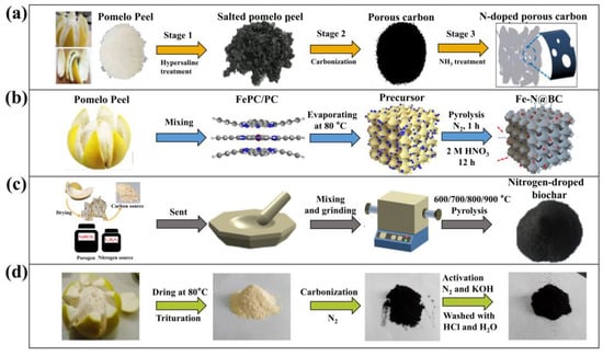 Wang et al. prepared the PP-derived porous carbon through a three-stage direct pyrolysis process (Figure 2a) [19]. In the first stage, dried PP was treated with hypersaline to initially expand the pores, resulting in a carbon precursor with abundant pores. In the second stage, the precursor was pre-carbonized at 400 °C for 3 h in an ammonia atmosphere, and then carbonized at 700 °C for 2 h to obtain the porous carbon. In the third stage, potassium hydroxide was used as a catalyst, and the precursor was activated for 2 h in an argon atmosphere, followed by high-temperature heating in a nitrogen atmosphere to dope nitrogen atoms. The resulting porous carbon material not only exhibits abundant pores and ultra-high SSA but also possesses the catalytic ability for redox reactions due to the abundant nitrogen doping. As the problem of Cr6+ pollution in water becomes increasingly severe, Yao et al. have proposed a biochar catalyst (BC) doped with iron and nitrogen (Figure 2b) [41]. Firstly, iron phthalocyanine (FePC) was mixed with PP. Then, the mixture was slowly dried at 80 °C. Finally, the mixture was carbonized at high temperature for 1 h under a nitrogen atmosphere and activated with HNO3 for 12 h to obtain Fe-N@BC. This material can efficiently catalyze the reduction of Cr6+ to the less toxic Cr3+. Dried pomelo peels can be co-ground with NaHCO3 and melamine, and then pyrolyzed at 600 °C for 2 h under a nitrogen atmosphere to obtain a highly nitrogen-doped biochar. This material can serve as an efficient catalyst for sulfamethoxazole (SMX) (Figure 2c) [42]. In particular, porous carbon nanomaterials that exhibit adsorption properties can be easily prepared using a simple and basic direct pyrolysis process (Figure 2d) [16]. Dried PP at 80 °C was carbonized for 1.5 h and 2.5 h at 450 °C and 800 °C, respectively, under a nitrogen atmosphere, and then activated using KOH in a nitrogen atmosphere. The resulting porous carbon exhibited significant adsorption properties for methyl orange and is cost-effective. Table 2 summarizes the preparation process of typical research of direct pyrolysis to prepare porous carbon.