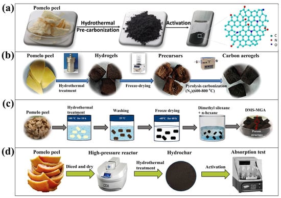 Zhu et al. prepared a structurally simple aerogel using only three steps (Figure 3c) [23]. Firstly, they dried the sliced pomelo peels at 180 °C for 10 h to obtain a sponge-like hydrogel. Then, the hydrogel was freeze-dried at −20 °C for 24 h, followed by vacuum-drying at −80 °C for 48 h to obtain the corresponding PP carbon aerogel precursors. Finally, the PP aerogel precursors was fully carbonized in a high-temperature nitrogen flow to obtain an ultra-lightweight carbon aerogel. This material exhibited significant adsorption performance for oil and various organic solvents on water surfaces. Imran et al. prepared a 3D porous superhydrophobic/superoleophilic carbon aerogel (Figure 3d) [55]. The dried pomelo peels underwent high-pressure hydrothermal treatment at 180 °C for 10 h, followed by freeze-drying at −40 °C for 60 h to obtain a carbon aerogel. The carbon aerogel was then surface-modified with dimethyl siloxane and cured at 120 °C for 3 h to acquire superhydrophobic/superoleophilic properties. Its sufficiently large pore size and superhydrophobic nature allowed it to effectively adsorb emulsified oil from the water surface. Table 4 summarizes the preparation process of typical research of the hydrothermal method to prepare aerogel.