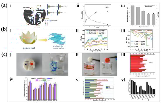 In addition to adsorbing chemical substances, PP-derived porous carbon is lightweight, antioxidant, and has a large SSA, making it a good substrate for electromagnetic absorption materials [87]. However, the lack of magnetic loss capability greatly limits its electromagnetic absorption performance. Hou et al. obtained sparsely structured porous carbon by pyrolysis of PP, with uniform growth of CoFe2O4 particles in the pores and covered with polyaniline (PANI) coating. CoFe2O4 particles and polyaniline can function as magnetic loss and dielectric loss, respectively, which gives the composite strong electromagnetic absorption ability [88]. Similarly, celery can also have electromagnetic absorption capacity through direct pyrolysis carbonization with Fe-Co deposition [89]. Zhao et al. treated the precursors with HAc-H2O2 solution after the hydrothermal pyrolysis PP step, where HAc reduced the thickness of the nanosheets and H2O2 increased the porosity. The obtained porous carbon had a graphene-like structure (Figure 4b(i)). Materials treated with 10% and 40% concentration of H2O2 are required to have an impedance matching of |Zin/Z0| close to 1 (Figure 4b(ii)), indicating that all incident electromagnetic microwaves penetrate the interior of the material, which is favorable for subsequent electromagnetic wave attenuation. Figure 4b(iii) shows that the material has good absorption of microwaves with a bandwidth from 1.9 mm to 5 mm, and the most obvious absorption of microwaves at 2.3 mm [85].