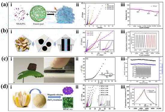 Porous carbon obtained by pyrolyze biomass is an ideal material for supercapacitors [101]. The surface layer of porous carbon can be modified with oxygen-containing functional groups [20] and nitrogen-sulfur dopants by direct pyrolysis of PP [102]. Li et al. mixed pomelo peel with NH4H2PO4 and used direct pyrolysis technology to prepare N, P co-doped hierarchical porous carbon nanosheets (Figure 6a(i)). It has a large SSA, abundant defects, and active sites, thus exhibiting strong electrochemical energy storage performance. Among them, the Nernst plot of the porous carbon nanosheets prepared at 750 °C had the largest slope in the low-frequency region (Figure 6a(ii)), indicating the smallest ion diffusion resistance and the lowest electrochemical impedance. Its storage capacity was excellent (314 ± 2.6 Fg−1). The capacitance retention rate was 99% after 10,000 cycles, and still remained at 86% after 30,000 cycles (Figure 6a(iii)) [29]. Fu et al. carbonized PP in a nitrogen atmosphere and activated the carbonized PP by mixing it with KOH (Figure 6b(i)). The porous carbon obtained at this temperature has a distinct stratified pore structure and is more suitable for application in supercapacitors. Figure 6b(ii) shows that the Nernst plot of the material prepared by carbonization at 700 °C is the most vertical in the low-frequency region, indicating the highest capacitance. However, the high-frequency region of the Nernst plot (inserted part) shows that the material prepared by carbonization at 600 °C has the largest slope, indicating that the diffusion resistance of electrolyte ions inside this material is low during the charging and discharging process and the diffusion path is short. The Figure 6b(iii) shows that the supercapacitor prepared at 600 °C has good capacitance capacity and cycling stability with a specific capacity retention rate of 96.2% after 10,000 cycles [103].
