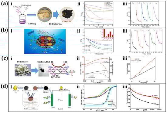 Given that porous carbon is chemically stable and does not easily react with acids and bases, it is also a suitable material for catalyst matrices [105,106]. Porous carbon nanomaterials derived from PP have been widely applied for catalyzing the decomposition of chemical substances in wastewater. Fe@pomelo-derived carbon can be prepared by hydrothermal pyrolysis of a mixture of PP powder and FeCl3·6H2O solution, and it can be used for catalyzing the degradation of p-nitrophenol in wastewater [107]. SMX, a bacteriostatic antibiotic, is widely distributed in pharmaceutical and livestock wastewater. Nitrogen-doped PP carbon treated with NaHCO3 can be used as an oxidation catalyst for the oxidation of SMX [42]. Metal-organic framework (MOFs) derived metal oxide/carbon catalysts have been widely studied in the field of environmental remediation. However, their support and aggregation have always been a challenge. Zhang and Dai utilized the strong water absorption ability of dried PP to fully absorb zeolitic imidazole framework-67 (ZIF-67) and co-thermally decompose it to obtain PP/ZIF-67 derivative composite material (Co3O4/C-PC) (Figure 7a(i)). It can efficiently activate peroxymonosulfate (PMS) to degrade ciprofloxacin (CIP) (Figure 7a(ii)) and maintain strong activation ability after multiple repetitions (Figure 7a(iii)) [108]. To address the threat of widespread use of antibiotics on the environment, a Co-Fe@ pomelo peel biochar composite (PPBC) composite material was proposed for the degradation of tetracycline (TC), which is extensively used in animal and human medicine and is non-degradable under natural conditions. The material utilizes electron transfer between Co2+ and Fe3+ to initiate the decomposition of PMS to generate SO4-, OH, and activated oxygen, which can promote TC decomposition. Figure 7b(ii) shows that the addition of ethanol (EtOH) and tert-butyl alcohol (TBA) has a significant inhibitory effect on TC removal, as these chemicals can efficiently remove SO4- and ∙OH, demonstrating that these two ions play a key role in TC degradation. During the process of repeated reuse, Co-Fe@PPBC also shows stable catalytic effects, demonstrating the feasibility of its recycling (Figure 7b(iii)) [109].