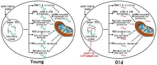 From the perspective of circadian rhythms, mitochondrial functions are regulated by both the clock and age-related mechanisms. In young animals, mitochondrial functions and redox states are rhythmic and integrated with daily changes in metabolic activities. Mitochondrial rhythms are disrupted during aging, when redox homeostasis is disturbed due to unbalanced ROS production and antioxidant defense, resulting in a net increase in oxidative stress. Age-related disruption of mitochondrial rhythms is associated with global changes in gene expression levels and rhythms in spite of intact tissue clocks. Such reprogramming of daily gene expression is a manifestation of plasticity in circadian rhythm control, and it involves TFs activated during aging (e.g., inflammatory TFs). How inflammatory TFs participate in reprogramming mitochondrial rhythms during aging should be characterized in detail in future studies. It is also of interest to examine the effect of CR on mitochondrial rhythms during aging. Finally, the phases of mitochondrial rhythms should be taken into account when administering daily pharmaceutical interventions aimed at healthy aging [108].