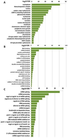 To gain insights into the biological functions associated with the nuclear LOXL2 interactome, Gene Ontology (GO) analyses were performed using the DAVID functional annotation tool [37,38]. Functional enrichment analysis of molecular functions using the GOTERM_MF_DIRECT category revealed several distinct groups of functionally related proteins involved in RNA metabolism (Figure 2A). The most significantly enriched term that originated from the analysis was related to the RNA-binding cluster. Comparison of the interactome with the RNA-binding protein (RBP) database [39] showed that 86% of the proteins (93 out 107) of the LOXL2 interactome were in fact RBPs (highlighted in red in Figure 1A). Indeed, the LOXL2 interactome functional enrichment analysis of biological processes using the GOTERM_BP_DIRECT category revealed that LOXL2-interacting RBPs cover all facets of RNA metabolism, including splicing, modification, intracellular trafficking, translation, and decay (Figure 2B) [40]. Additionally, most of the LOXL2-interacting RBPs identified in this study have been associated with different cancer traits [41,42,43,44,45] and are being used as potential targets for cancer therapeutics [46]. The finding of these RBPs as potential partners for LOXL2 allows us to hypothesize the modulation of RBPs’ function as a new molecular mechanism of LOXL2’s action in tumor progression.