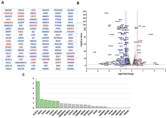 RBP candidates to be regulated by LOXL2: (A) List of differentially expressed genes in LOXL2-silenced cells with a described role in EMT. Up- and downregulated genes are marked in red and blue, respectively. (B) Volcano plot showing LOXL2-regulated EMT-related genes. The cutoffs were established at the log2 fold change > 1.0 (red line) or <−1.0 (blue line) and the p-value < 0.05 (grey line). Red and blue dots denote up- and downregulated EMT-related genes, respectively. (C) Enrichment plot of RBPs’ targets in the EMT-related signature relative to the non-EMT-related signature. The p-values were obtained by using Fisher’s exact test to compare the number of targets in both groups of genes. A p-value < 0.05 was considered statistically significant. Boxes marked in green represent significantly enriched RBPs.