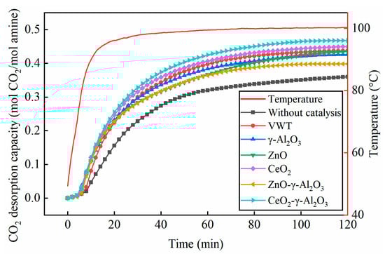 The desorption capacity of BZA-AEP was investigated for 2 h using various catalysts, including a commercial VWT catalyst, three precursor catalysts, and two M-γ-Al2O3 (M = ZnO or CeO2) Lewis acid catalysts. It can be seen from Figure 1 that CeO2-γ-Al2O3 exhibited the best catalytic effect, and the capacity of carbon dioxide desorption increased by 30% compared with the case without catalyst. The characterization analysis showed that this benefited from the large specific surface area and acidity of CeO2-γ-Al2O3, which increased active catalytic surface. The catalyzed desorption performance follows the order: CeO2-γ-Al2O3 > CeO2 > VWT ≈ ZnO > γ-Al2O3 > ZnO-γ-Al2O3 > without catalyst. During the initial 20 min, the desorption capacity for each catalyst in the high carbon dioxide-loaded absorbent exhibit minimal differences, indicating that each catalyst possesses a strong catalytic desorption capability. In the mechanism of Lewis acid catalyst catalysis [3], the acidic sites on the catalyst’s surface interact with oxygen atoms in the absorbent, facilitating the decomposition of carbamate and the subsequent release of carbon dioxide.