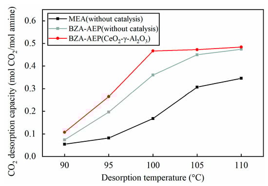 The impact of CeO2-γ-Al2O3 catalyst on the catalytic desorption of BZA-AEP was investigated for a duration of 2 h at desorption temperatures ranging from 90 °C to 110 °C. It can be clearly seen from Figure 3 that, with the increase of the desorption temperature, the difference in the desorption capacity within 2 h between catalyst catalysis and no catalyst catalysis presents a first increasing and then decreasing trend. Notably, the CeO2-γ-Al2O3 catalyst demonstrates the most significant increase in BZA-AEP desorption capacity at a 100 °C desorption temperature. Under the catalysis of CeO2-γ-Al2O3, the desorption capacity of BZA-AEP increased by 2–46% compared to no catalyst, signifying the substantial advantage of the CeO2-γ-Al2O3 catalyst in improving BZA-AEP desorption capacity. Furthermore, in comparison with the MEA desorption capacity of no catalyst, the desorption amount of BZA-AEP catalyzed by CeO2-γ-Al2O3 increased by 40–222%.