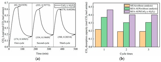 According to the results in Section 3.2, the cycle desorption temperature was set at 100 °C. As observed in Figure 5a, the loading of the BZA-AEP rich solution reached 0.63438 mol CO2/mol amine during the initial absorption and desorption process. In the subsequent two cycles, the rich solution load experienced a slight decrease, stabilizing at approximately 0.6 mol CO2/mol amine. This decrease can be attributed to some amine absorbent and carbamates were adsorbed on the surface of the fresh catalyst during the first cycle, so that this part of amine absorbent failed to enter the absorber to participate in the absorption process. Concurrently, the lean liquid loading increased marginally in the last two cycles compared to the first cycle and stabilized at around 0.2 mol CO2/mol amine, further corroborating the hypothesis that some amine absorbent and carbamates were adsorbed on the catalyst surface. It can be seen from Figure 5b that the desorption capacity of the absorbent tends to be stable after the first cycle. Under the catalysis of CeO2-γ-Al2O3, the cycle capacity of BZA-AEP reaches 0.40147 mol CO2/mol amine, which is 31% higher than that of uncatalyzed BZA-AEP and 108% higher than that of uncatalyzed MEA.
