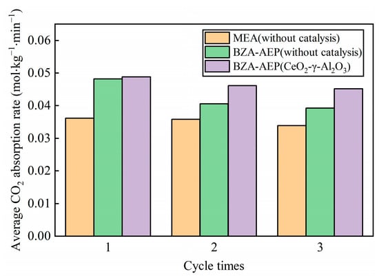 It can be seen from Figure 6 that the average absorption rate of BZA-AEP catalyzed by CeO2-γ-Al2O3 is higher than that of uncatalyzed BZA-AEP during the second and third cycles. The reason for this phenomenon is that the BZA-AEP catalyzed by CeO2-γ-Al2O3 releases more carbon dioxide during the desorption process. The concentration of amines not bound to carbon dioxide in BZA-AEP lean solution catalyzed by CeO2-γ-Al2O3 is higher than that in BZA-AEP lean solution without catalysis: the higher the amine concentration, the faster the reaction rate of amine and carbon dioxide.