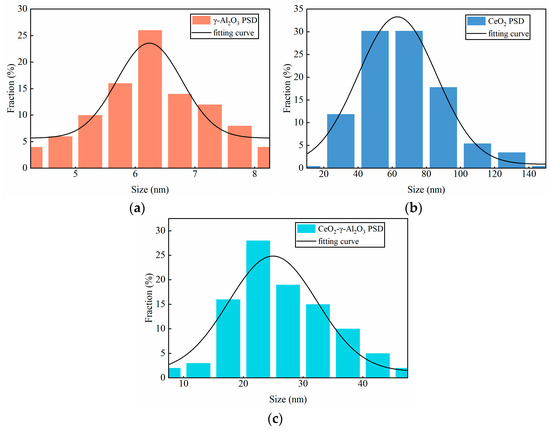The morphology of the catalyst was examined utilizing the Sigma 300 scanning electron microscope (SEM) both before and after its usage. Figure 8a–d display the SEM images of γ-Al2O3, CeO2, fresh CeO2-γ-Al2O3, and CeO2-γ-Al2O3 catalyst after three times cycle, respectively. The γ-Al2O3 (Figure 8a) shows that the catalyst is aggregated from extremely fine particles. The SEM images of CeO2 (Figure 8b) corroborate the spherical morphology of CeO2 nanoparticles [19]. The fresh CeO2-γ-Al2O3 catalyst (Figure 8c) displays a high dispersion of γ-Al2O3 among CeO2 nanoparticles. In the SEM image of the CeO2-γ-Al2O3 catalyst (Figure 8d) after three times cycle, we can see that the surface of the catalyst has not changed significantly, but the aggregation between the particles has become tighter. This observation aligns with the experimental data presented in previous sections, further substantiating the exceptional stability of the CeO2-γ-Al2O3 catalyst. Figure 9 reveals that the catalyst particle size distribution follows a Gaussian distribution. The γ-Al2O3 catalyst has a mean particle size of 6.35 nm, with a standard deviation of 1.06 nm. The CeO2 catalyst exhibited an average particle size of 67.17 nm and a standard deviation of 24.59 nm. The CeO2-γ-Al2O3 catalyst displayed an average particle size of 26.76 nm and a standard deviation of 8.40 nm.
