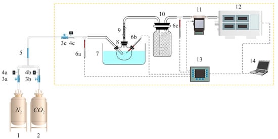 Flow chart of the experimental setup [11] (1. N2 cylinder, 2. CO2 cylinder, 3. flow control valve (3a,3b,3c), 4. gas flow meter (4a,4b,4c), 5. gas mixer, 6. temperature sensor (6a,6b,6c), 7. oil bath, 8. three-neck flask, 9. condenser tube, 10. drying bottle, 11. mass flow meter, 12. flue gas analyzer 13. data acquisition instrument, 14. computer).