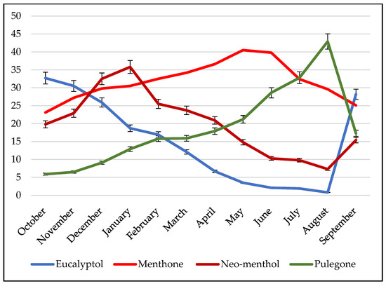 The chemical variability of essential oils presents advantages and disadvantages in their use. In some cases, the chemical profile of an essential oil can restrict its application, as demonstrated by the hepatotoxic compound pulegone that is found as a major component in the essential oil of Mentha pulegium [48,49]. The toxicity associated with the major compound, pulegone, limits the industrial use of this oil. However, studying the variation in the chemical composition throughout the vegetative cycle of this species reveals the potential utilization of two compounds highly sought after by the flavor and fragrance industry: eucalyptol and menthol.