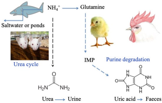 Amino acids are transferred to glutamate by transaminases, and the nitrogen produced by the oxidative deamination reaction needs to be processed. In fish, this becomes ammonia, which is discharged directly into seawater, lakes, and rivers for disposal. In mammals, on the other hand, it becomes urea in the urea cycle and is disposed of as a component of urine. Birds, conversely, synthesize purines, which are eventually converted to uric acid and disposed of as solid feces. Birds generally have a high XDH activity, which is even higher if they are on a high-protein diet.
