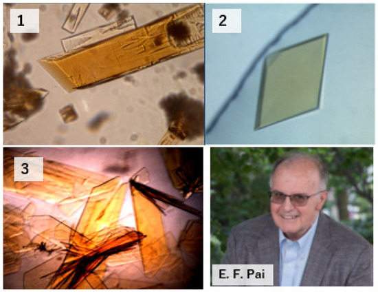 Micrographs of bovine milk crystals. XO was obtained in 1986 (1), in 1998 (2), and XDH was grown in 1998 (3), and Emil F. Pai in bottom-right panel.