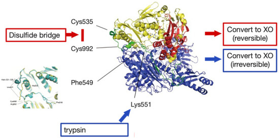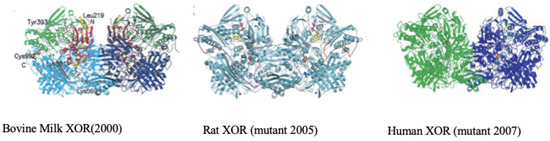 The overall crystal structure of the XOR enzyme is shown in Figure 5. The overall images are shown to be similar. The details vary greatly between XDH and XO. The text gives an overview and background of the research into the analysis of the conversions. Using this experimental system, the mechanism of the conversion of XDH to XO and the conversion of protein molecules was greatly advanced [36,37,38,39,40]. The conversion of XDH to XO (Figure 6) and the conversion of protein molecules were carried out simultaneously to elucidate their various crystal structures.