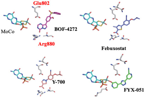 Illustrations of the structures of the inhibitors at the active centers of XORs were developed in Japan and studied by the authors of this paper, respectively. The mechanism and strength of inhibition are not the same conditions for each; see the results in the following papers: BOF-4272 [41], TEI-6720 (Febuxostat) [42], Y-700 [43], and FYX051 (Topiroxostat) (Figure 7) [44,45] surrounding proteins. The dynamic structure around the MoCo of the bacterial enzyme, which will be discussed below, was also revealed.