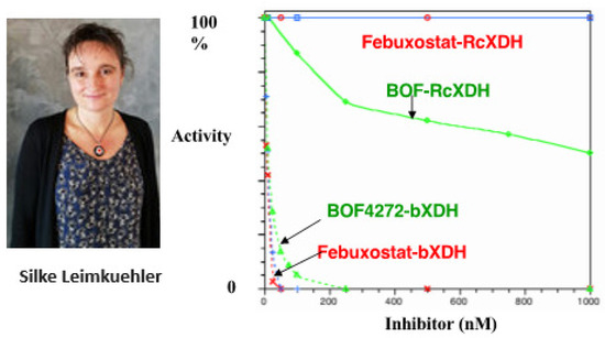 Another important aspect of XDH was learned from this bacterial enzyme. Silke Leimukuller, from Germany, was invited to Tokyo. Various inhibitors were ineffective against this bacterial enzyme, except for allopurinol. The steric structure was apparently similar to a molecular replacement that was obtained from milk enzymes. However, its behavior towards inhibitors was very different. The reason for this was not the active center but the kinetic properties of the protein structure of the enzyme. Furthermore, it has already been reported that the enzyme XDH is converted to XO only in this mammalian species. Remarkably, this bacterial enzyme is always stable. The S atom of the active center, MoCo, was very stable and did not alter its activity. The reaction kinetic analysis using the stop-flow method was relatively stable [47]. However, the effects of inhibitors on this enzyme were unusual. Allopurinol inhibited it, but its mode of binding to the protein appeared to be in a different orientation from that of mammals. Surprisingly, as shown in Figure 9, TEI (Febuxostat), which strongly inhibits mammalian XOR, did not inhibit the bacterial enzyme she brought with her at all (100% enzyme activity was preserved). In contrast, BOF, which was an order of magnitude weaker, did inhibit the enzyme to some extent (Figure 9). This was related interestingly to fluctuations in the surrounding proteins [48]. Therefore, it was also found that enzymes from non-mammalian animals were not directly applicable to enzymological, physiological, pathological, or pharmacological studies.