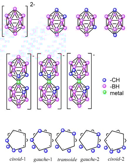 Figure 1 shows the inorganic icosahedral closo-dodecaborate ([B10H12]2−), the dicarba-closo-dodecaborane (closo C2B10H12), which exists in three isomeric forms that are named based on the positioning of the two CH vertices: 1,2- or ortho-, 1,7- or meta-, and 1,12- or para-carborane and, the sandwich metallabis(dicarbollides) [M(C2B9H11)2]− (M = Co3+, Fe3+). Five different conformations can be found in the metallabis(dicarbollides): cisoid-1, gauche-1, transoid, gauche-2 and cisoid-2. However, cisoid-1 and cisoid-2, as well as gauche-1 and gauche-2, are equivalent in the non-substituted or symmetrically disubstituted clusters [35].