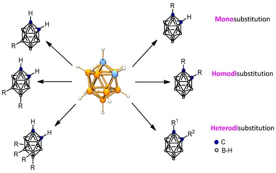 Schematic representation of some substituted closo ortho-carboranes at the B vertices (left), at the C vertices (right). Blue circles represent the C atoms, while orange ones the B atoms and white ones are the B atoms or B-H vertices (H atoms omitted for clarity).