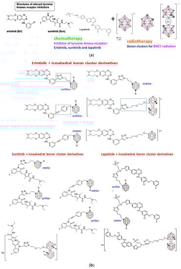 (a) Schematic representation of the two components (inhibitors of kinases receptor + icosahedral boron clusters) of the designed hybrid molecules with potential dual action. (b) The newly synthesized neutral and anionic boron clusters, which contain quinazoline molecules with potential dual action (chemotherapy + radiotherapy) result in significant clinical benefits [66,67,68]. The black, circles represents C atoms or Cc-H vertices, the pink circles represent B–H vertices and the purple ones Boron atoms.