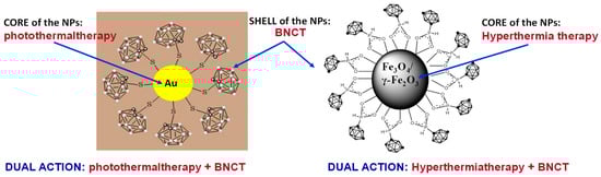 Neutral carboranes onto nanoparticles (gold NPs and magnetic NPs) as vehicles for cancer treatment [71,74]. Both families offer the possibility of dual action (photothermaltherapy + BNCT or hyperthermaltherapy + BNCT), which may result in significant clinical benefits [73].