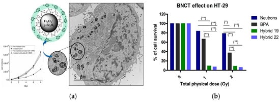 (a) CryoTEM image of glioblastoma A172 cancer cell after carborane-magnetic nanoparticles uptake and proliferation curves of A172 cells re-plated one day after BNCT treatment. BNCT studies were carried out by incubating A172 cells for 24 h with carborane-magnetic nanoparticles (20 μg/mL boron). The amount of internalized boron measured by ICP-MS was 133 ± 25 μg/g, corresponding to a 10B concentration of 26 ± 5 μg/g [73]. (b) Effect on HT-29-cell survival without or with hybrids or BPA treatment post-neutron-irradiation (1 and 2 Gy). Compounds were studied at doses equivalent to 10.0 ppm of 10B for 1 h of incubation. (*) p < 0.05; (**) p < 0.01. Reproduced from Ref. [61] with permission from Wiley & Sons.