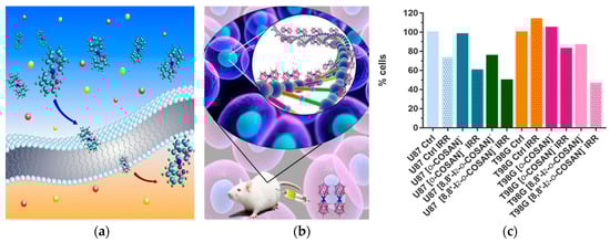 Schematic representation of (a) the [o-COSAN]− ability to readily cross cell membranes [65] and (b) [o-COSAN]− interaction with DNA [71]. (c) Percentage of viable U87 and T98G cells 24 h after neutron irradiation.