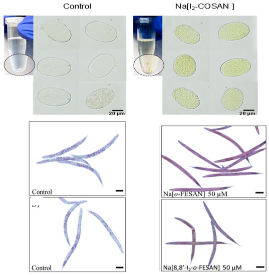 Optical microscopy images of C. elegans. (Top): The embryos and, (bottom): At the L4-stage before (control) and after incubation with Na[8,8′-I2-o-COSAN] 200 μM [86].