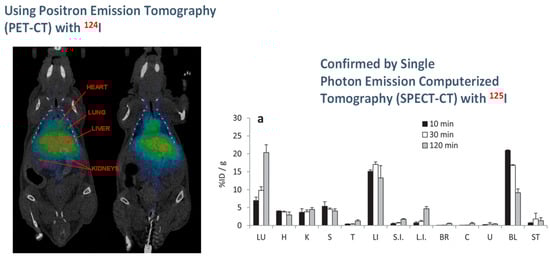 Finally, in vivo evaluation in mammalian mice models were run trying to understand the ability of [o-COSAN]− to target the tumor cells, as well as to cross the blood–brain barrier. After intravenous administration, biodistribution studies of Na[o-COSAN] in BALB/c CrSlc mice (female, 5 weeks old) were run. Anionic [o-COSAN]− was distributed into many organs but mainly accumulated in the reticuloendothelial system (RES), including liver and spleen (Figure 9) [83].