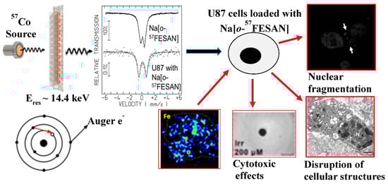 Mössbauer spectrum and 2D elemental maps of Fe distribution indicate that [o-57FESAN]− is present inside U87 cells, an important requisite for selective energy deposition by Mössbauer absorption. Reproduced from [88] with permission from the Royal Society of Chemistry.