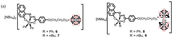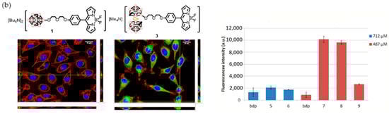 Our interest in the development of new boron delivery systems to be used for biological applications led us to prepare a family of fluorescent organotin compounds that have shown excellent properties as nucleoli and cytoplasmic markers in vitro [130]. These organotin compounds are based on 4-hydroxy-N′-((2-hydroxynaphthalen-1-yl)methylene)benzohydrazidato that was derivatized to contain two different boron clusters, [B12H12]2− and [o-COSAN]− following the oxonium ring opening reaction (6–9 in Figure 13a). These compounds showed photoluminescence properties in solution with ΦF values in the range from 24% to 49%. Remarkably, linking these anionic boron clusters to tin complexes improved their solubility in cell media, which resulted in better cell internalization and higher cellular uptake, as they do not aggregate either on the cell surface or in the extracellular media. Mouse melanoma B16F10 cells were incubated with 10 µg/mL of the different compounds for 2 h and then analyzed by confocal laser microscopy. Noticeably different staining effect was observed depending on the type of boron cluster attached to the organotin complexes. Compound 8 bearing the [o-COSAN]− anion and two phenyl rings coordinated to the Sn showed an important fluorescence in the cytoplasm, whereas that bearing [B12H12]2− (6) produced extraordinary nucleoli and cytoplasmic staining (Figure 13b). The remarkable fluorescence staining properties of these organotin compounds in B16F10 cells make them excellent candidates for in vitro fluorescent bioimaging.