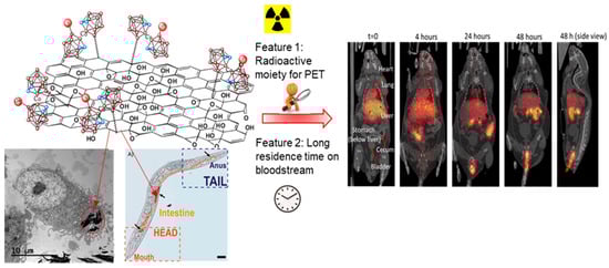 Besides previous luminescent materials, our group has also prepared carbon-based nanomaterials, which consist of graphene oxide (GO) functionalized on the surface by monoiodinated cobaltabis(dicarbollide) (GO-I-COSAN) for in vivo bioimaging. This GO-I-COSAN has been synthesized using the cobaltabis(dicarbollide) containing a B-I group and an amino group (I-COSAN) that is subsequently labeled with radioactive 124I (Scheme 5) for its use in positron emission tomography (PET) [135]. After incubation of HeLa cells with different concentrations of GO-I-COSAN for 48 h, the results indicated that the nanomaterial was not cytotoxic, with cell mortality lower than 10%. Remarkably, internalization of the nanomaterial by cells was clearly confirmed by transmission electron microscopy (TEM), which showed that the GO-I-COSAN was accumulated in the cytoplasm without causing changes in either the size or morphology of the cells. Further in vivo studies using C. elegans indicated that GO-I-COSAN was ingested by the worms, showing no significant damage and very low toxicity, which supports the results observed in vitro. Radioisotopic labeling of I-COSAN using a palladium-catalyzed isotopic exchange reaction with Na[124I]I and its subsequent functionalization onto GO was performed successfully, leading to the formation of the radioactive nanocomposite GO-[124I]I-COSAN (Scheme 5). The radiolabeled nanomaterial was injected into the mice, and PET images at different times were taken (Figure 16), which revealed no activity in the thyroid and stomach even at long times, indicating that iodide did not detach from the material. GO-[124I]I-COSAN presented a favorable biodistribution profile, with long residence time on blood, mainly accumulated in the liver and slightly in the lung, and progressive elimination via the gastrointestinal tract. It is noteworthy that the high boron content of this material paves the way toward theranostics because it benefits traceable boron delivery for BNCT.