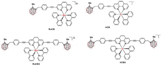 - Conway-Kenny, R.; Ferrer-Ugalde, A.; Careta, O.; Cui, X.; Zhao, J.; Nogués, C.; Núñez, R.; Cabrera-González, J.; Draper, S.M. Ru(II) and Ir(III) phenanthroline-based photosensitisers bearing o-carborane: PDT agents with boron carriers for potential BNCT. Biomater. Sci. 2021, 9, 5691–5702. [Google Scholar] [CrossRef] [PubMed]