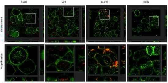 Orthogonal projection of z-stacks of live SKBR-3 cells incubated with 10 µM RuCB, IrCB, RuCB2, or IrCB2 for 4 h and observed under CLSM. (Top row): To analyze the localization of the compounds, fluorescence mode was used. Compound luminescence emission was detected in the range of 614–760 nm (red) by exciting the cells using the λex 405 nm laser. Wheat Germ Agglutinin (WGA) fluorescence emission (membrane) was detected in the range of 496–579 nm (green) by exciting the cells using the λex 488 nm laser. (Bottom row): Magnification of the selected areas (square boxes). Scale bar, 5 µm [136].