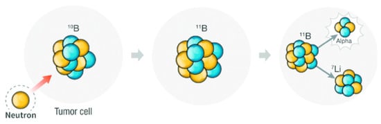 Representation of the Boron Neutron Capture Therapy reaction (BNCT). Blue circles represents protons while yellow ones neutrons.
