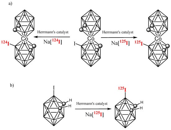 Isotopic exchange: (a) Between [124I]iodide, [125I]iodide, and the anionic [8-I-o-COSAN]− cluster, (b) between [125I]iodide and the neutral 3-iodo-o-carborane cluster by using Herrmann’s catalyst (the organopalladium compound made by reaction of tris(o-tolyl)phosphine with palladium(II) acetate).